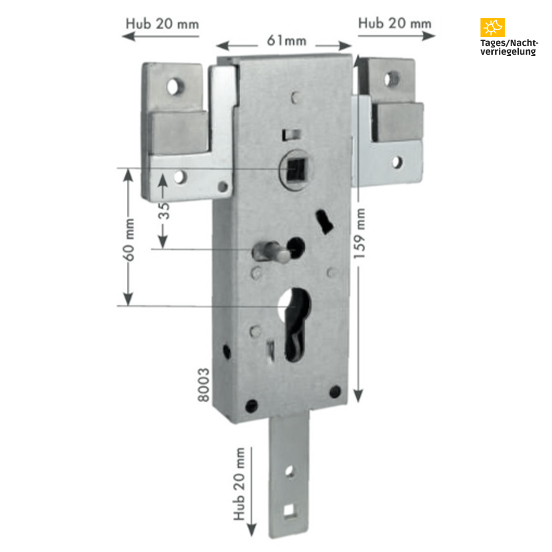 Das Garagentorschloss 8003 mit Tagesentriegelung betätigt drei Stangen gleichzeitig, zwei horizontal und eine nach unten. Das Garagentor ist entweder auf- oder abgeschlossen, die Öffnung erfolgt von außen durch die Betätigung des Schlüssels oder von innen über den Klavierknopf.