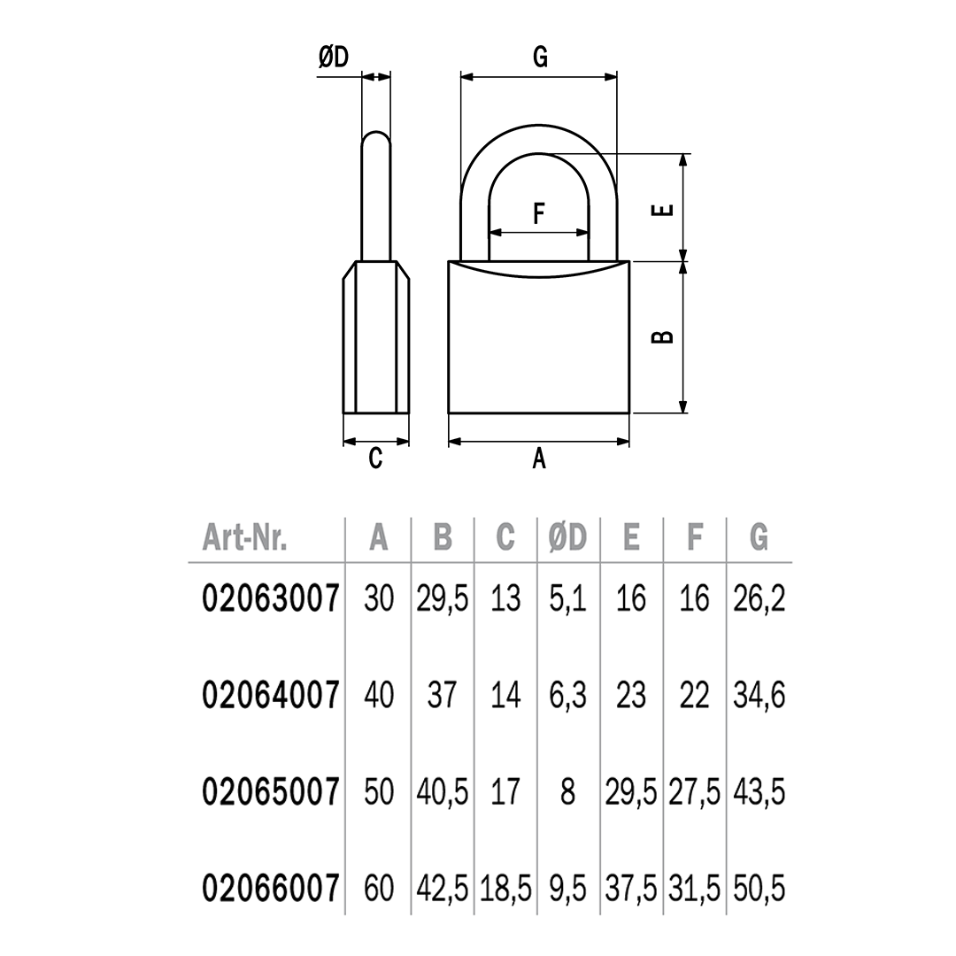 - Abmessungen: A = 30 mm, B = 29,5 mm, C = 13 mm, D = 5,1 mm, E = 16 mm, F = 16 mm, G = 26,2 mm