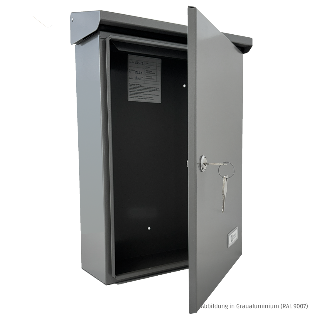 Briefkasten 03-116 der JU-Serie 03 in Eisenglimmer mit Einwurfklappe und vorderseitiger Entnahme. Produktbeschreibung Der Einzelbriefkasten 03-116 mit Einwurfklappe ist aus feuerverzinktem Stahlblech gefertigt. Der Einwurf erfolgt von oben und die Entnahme auf der Vorderseite. Technische Daten Material: feuerverzinktes Stahlblech Oberfläche: matt Farbe: Eisenglimmer, DB 703 Abmessungen Kasten (HxBxT): 370 x 270 x 110 mm Abmessungen Klappe (HxBxT): 50 x 285 x 125 mm Einwurf (BxH): 230 x 35 mm, DIN C4 entspricht DIN EN 13724 Lieferumfang 1x Briefkasten 03-116 Eisenglimmer 1x Einwurfdeckel 1x Zylinderschloss 2x Schlüssel 1x Namensschild